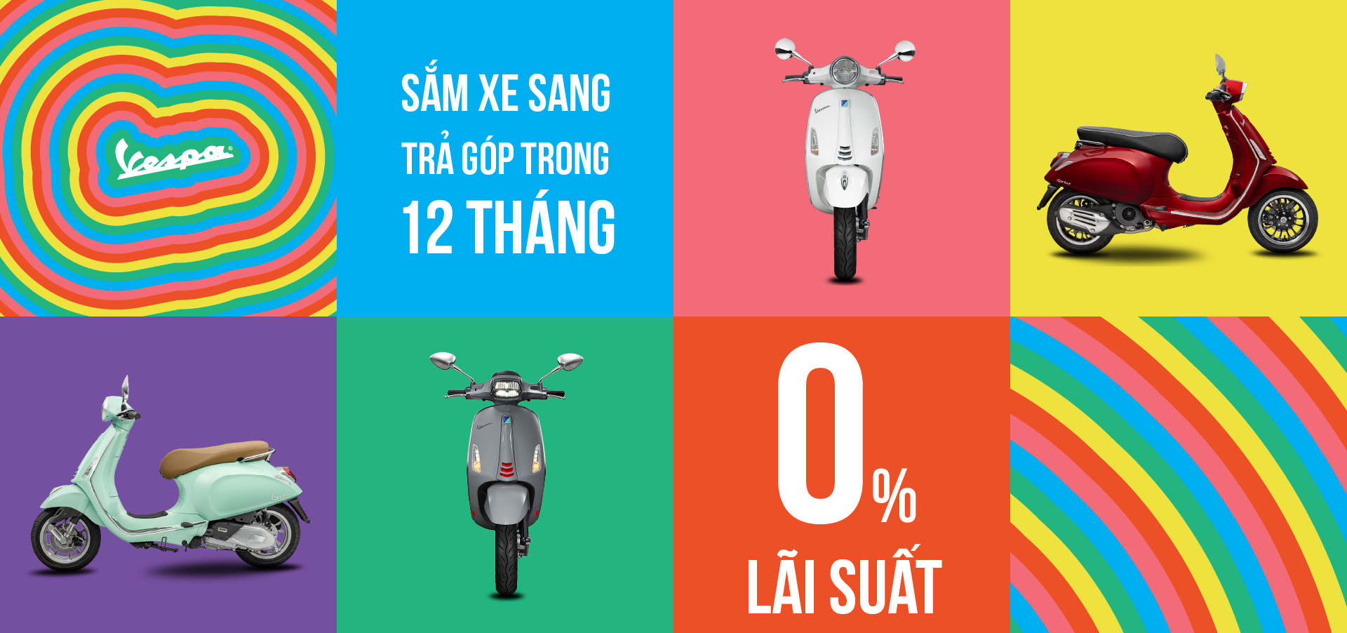 Sở hữu một chiếc Vespa sang trọng đã trở nên dễ dàng cùng ưu đãi trả góp 0% lãi suất nay càng thêm hấp dẫn với các mức trả trước vô cùng linh hoạt dành cho các mẫu xe cao cấp Vespa Sprint, Vespa Primavera.